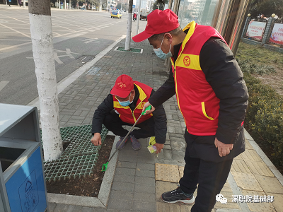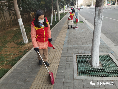 基础部主任朱献周带队,带领党员教师拿着扫帚、垃圾斗、垃圾夹、抹布等工具,对分包路段人行道和绿化树旁的烟头、纸屑、果皮等垃圾进行了细致清理。