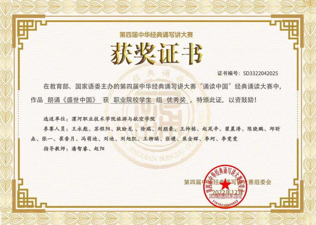 第四届中华经典诵写讲大赛历经地区初赛、全国复赛和全国总决赛,于近期落下帷幕。由我校旅游与航空学院教师潘智睿、赵阳指导的作品《盛世中国》荣获全国优秀奖。